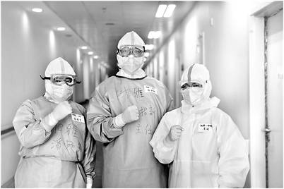 圖為湘雅醫(yī)院第七黨總支紀(jì)檢委員錢(qián)招昕(中)和援鄂醫(yī)療隊(duì)在武漢協(xié)和醫(yī)院西院區(qū)重癥病房?jī)?nèi)相互鼓勵(lì)。